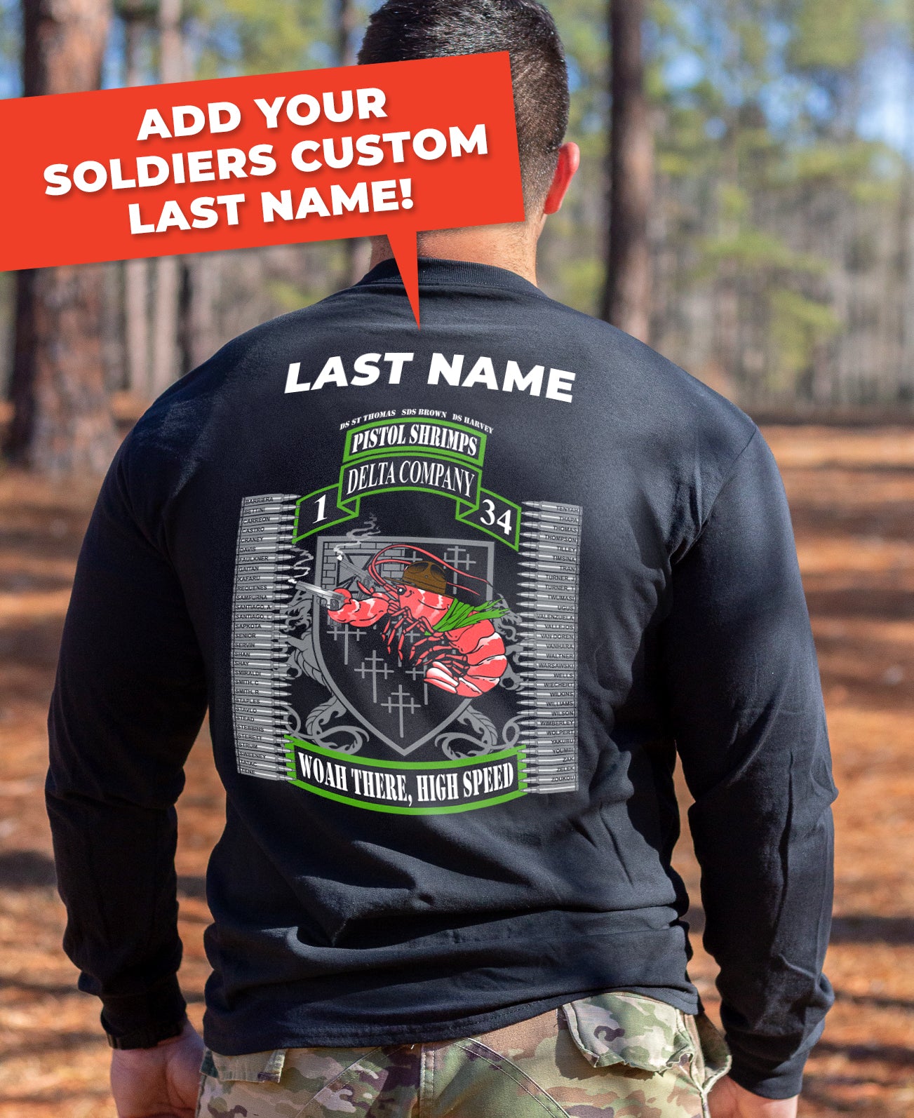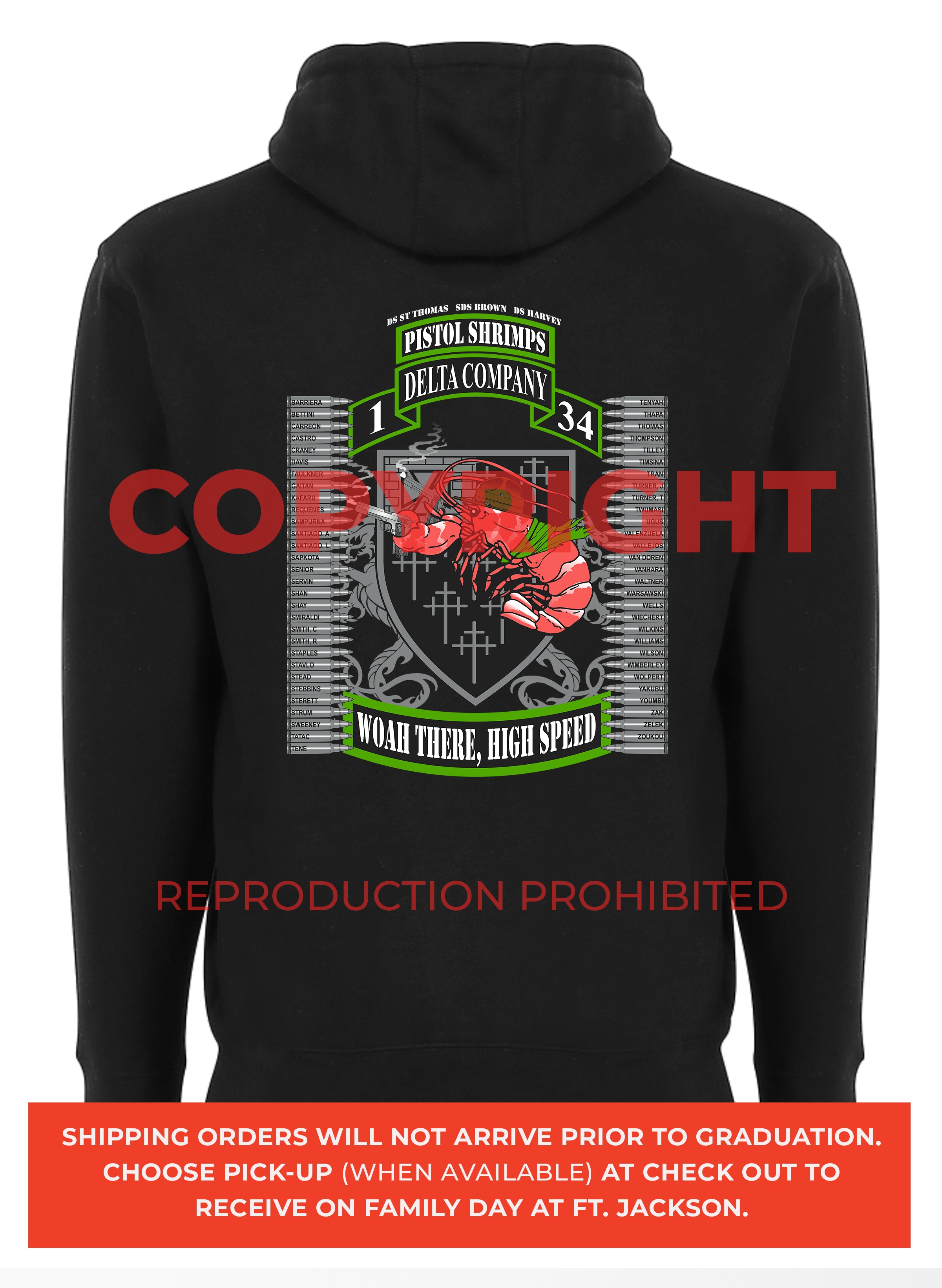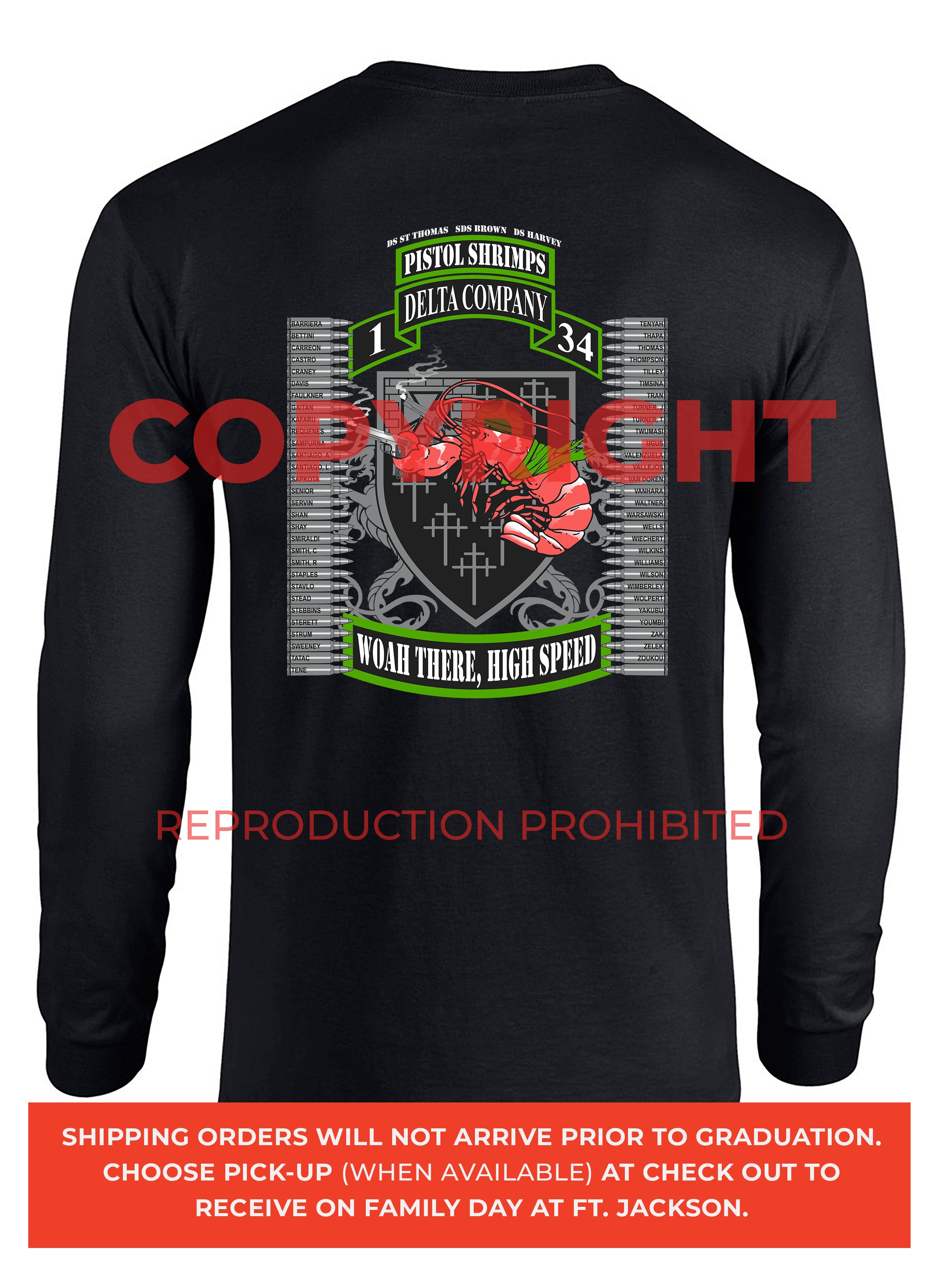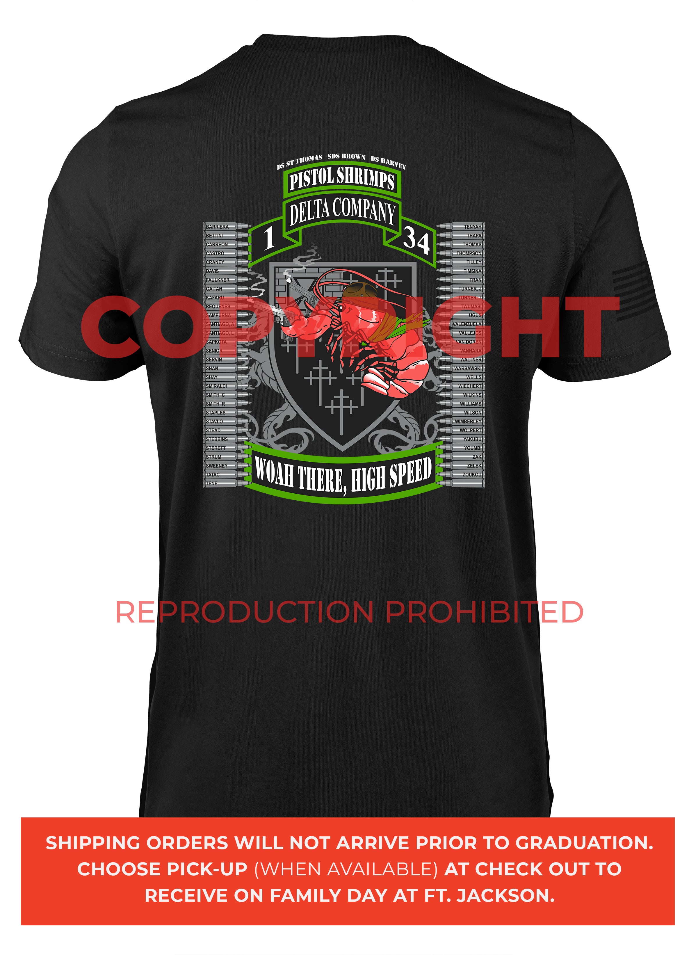 *Begin shipping the week of the graduation because shirts are custom made each week for the Soldiers, then we are able to ship the remainder to you at home!