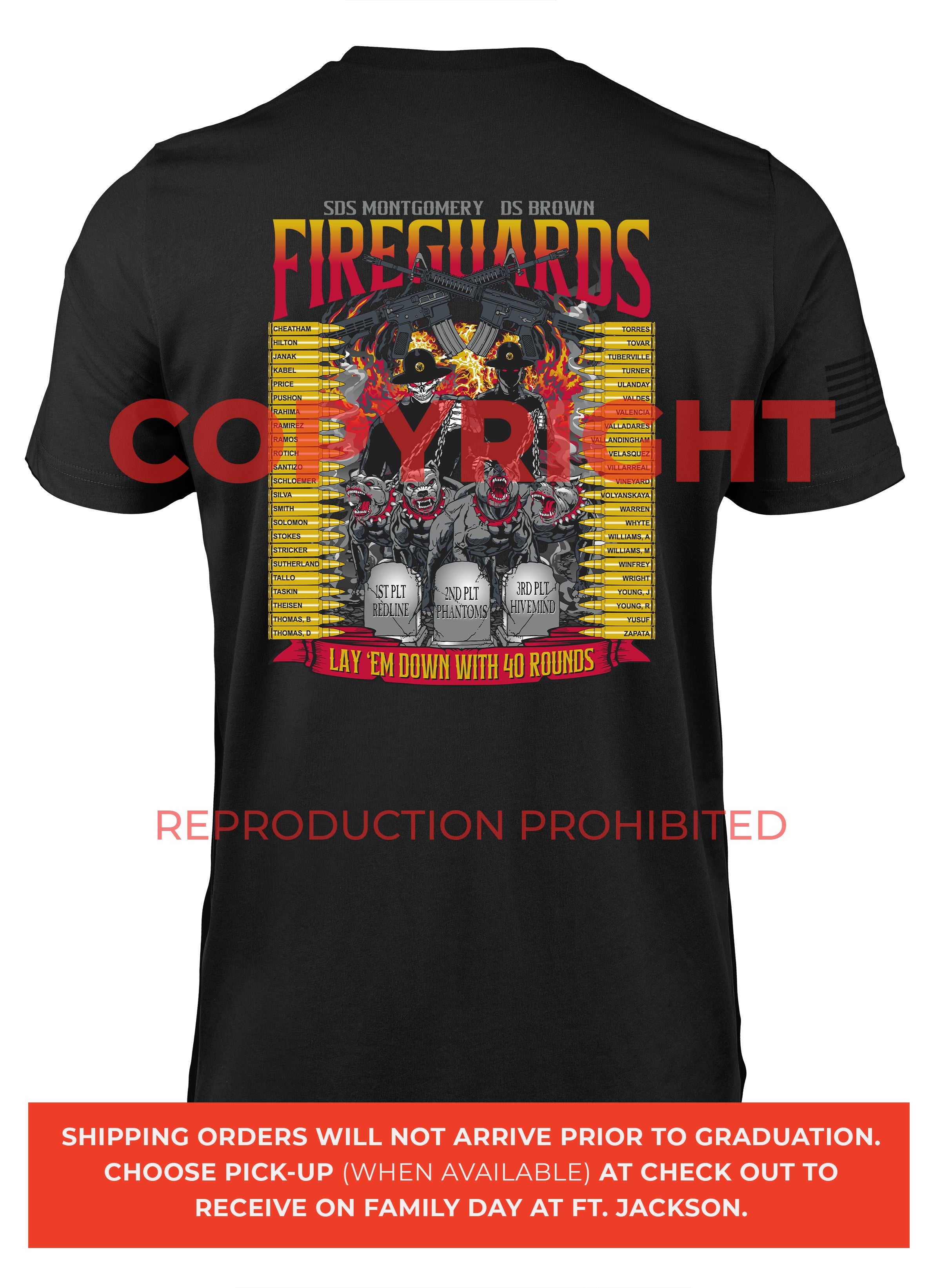 *Begin shipping the week of the graduation because shirts are custom made each week for the Soldiers, then we are able to ship the remainder to you at home!