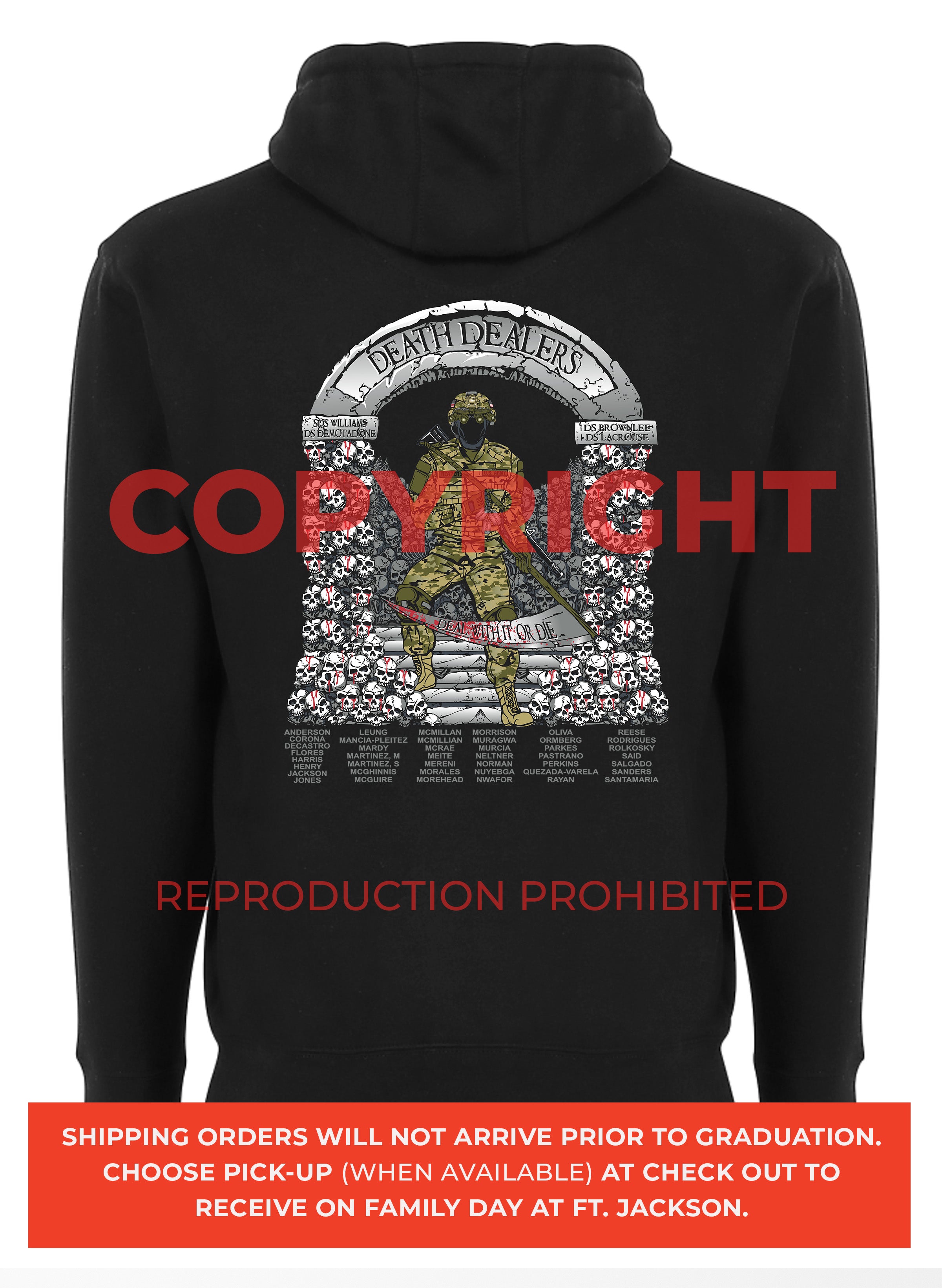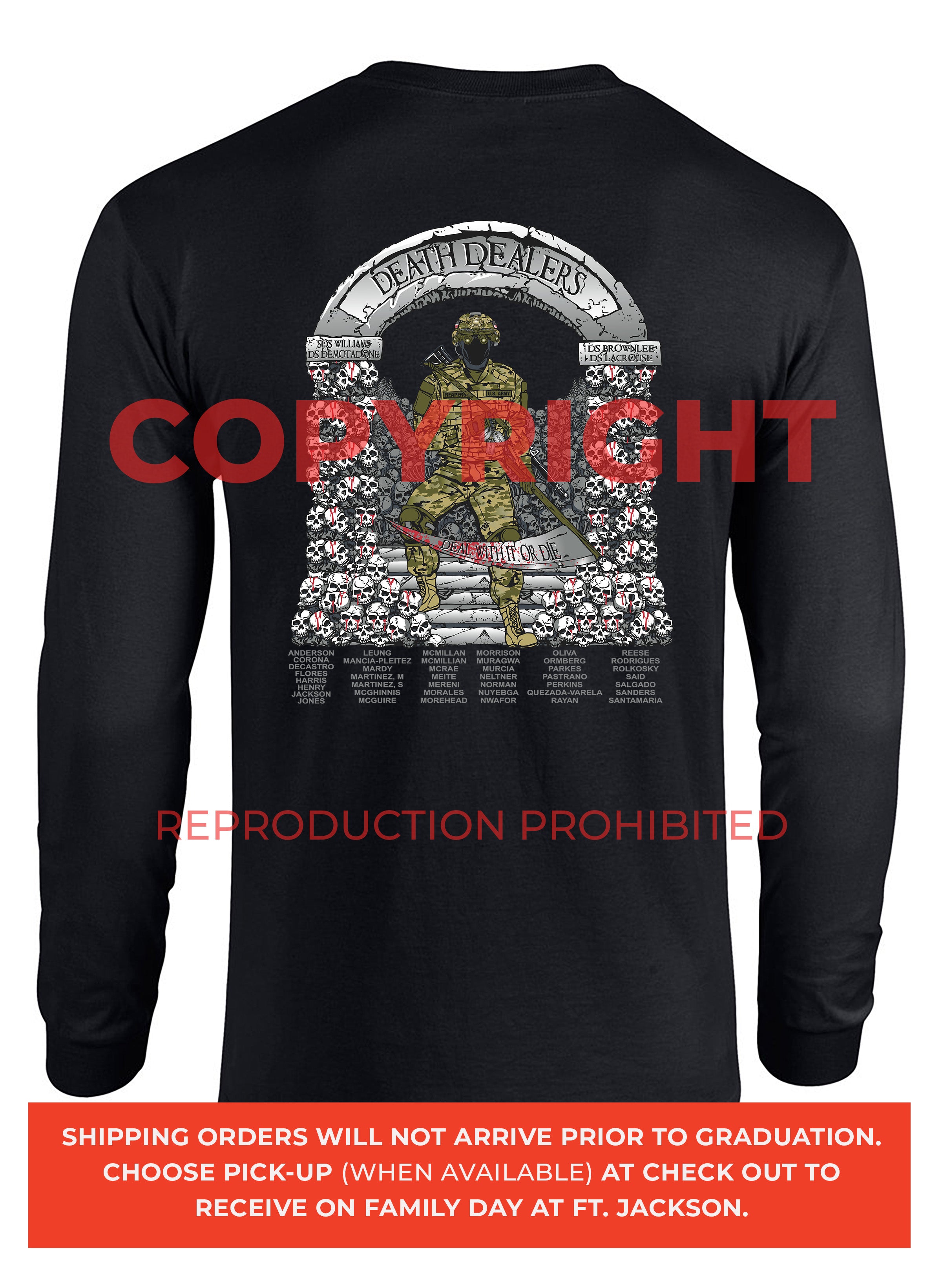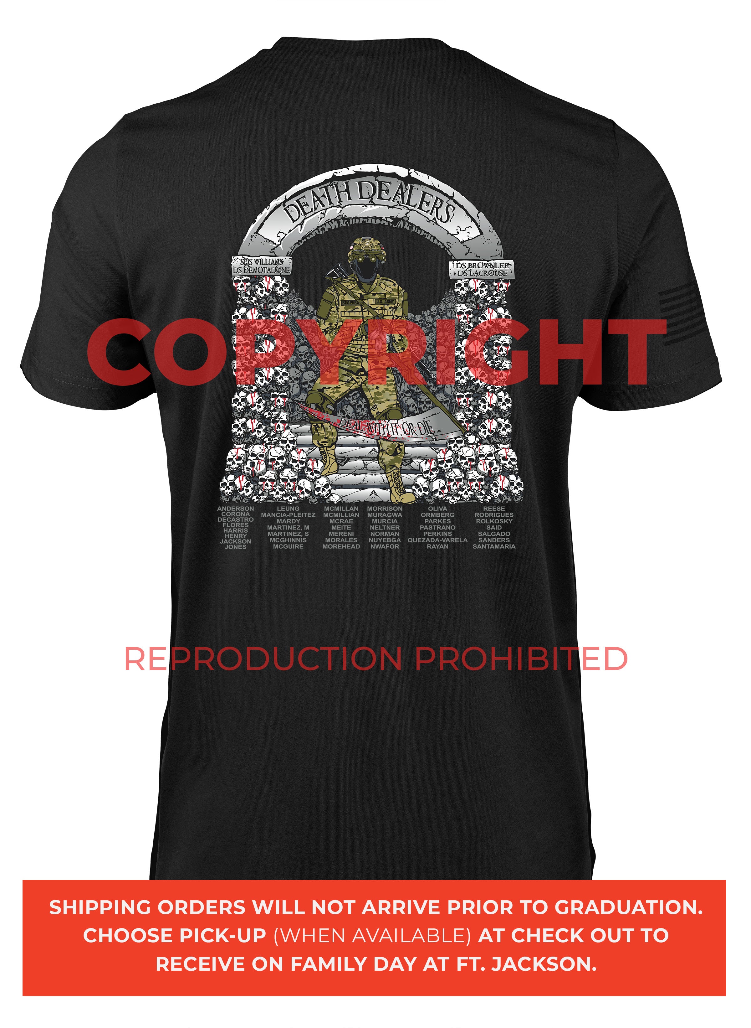 *Begin shipping the week of the graduation because shirts are custom made each week for the Soldiers, then we are able to ship the remainder to you at home!