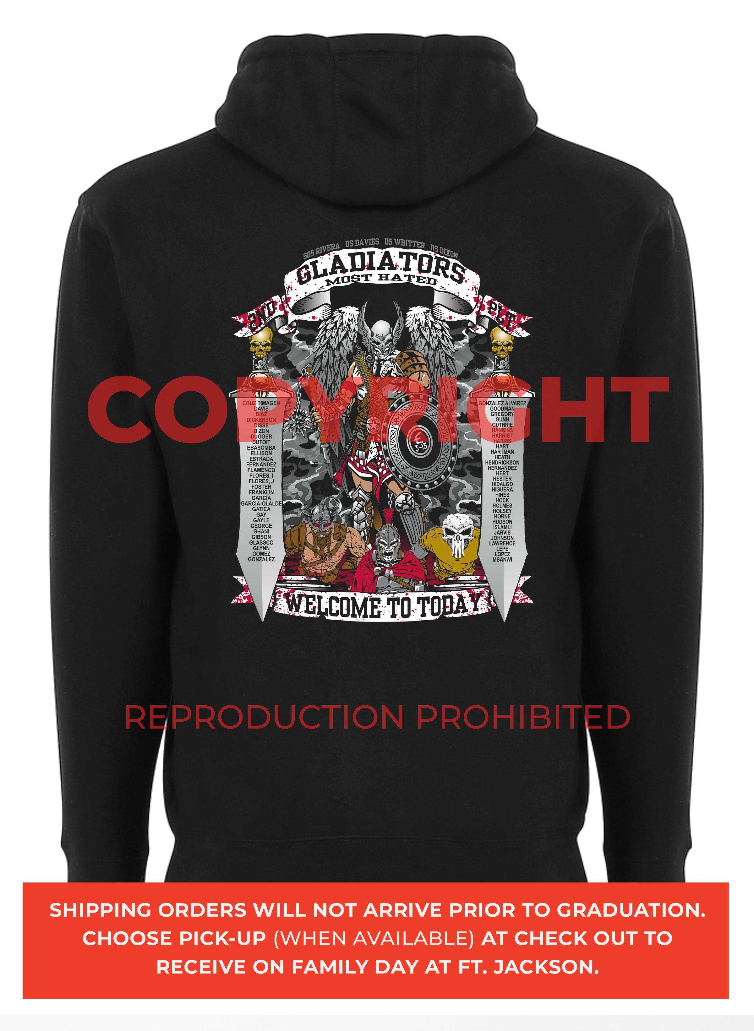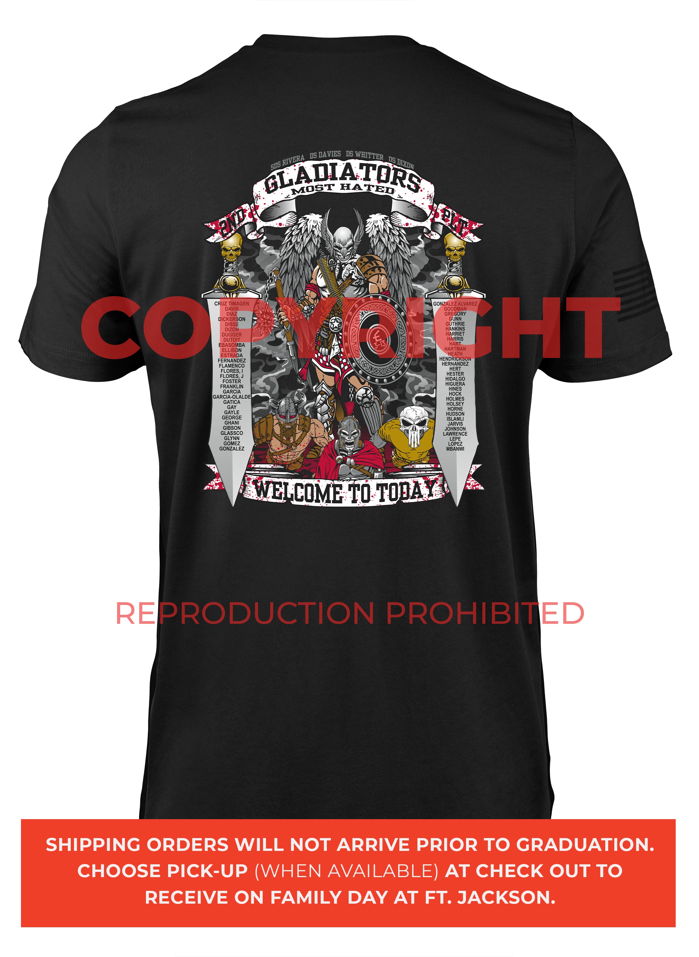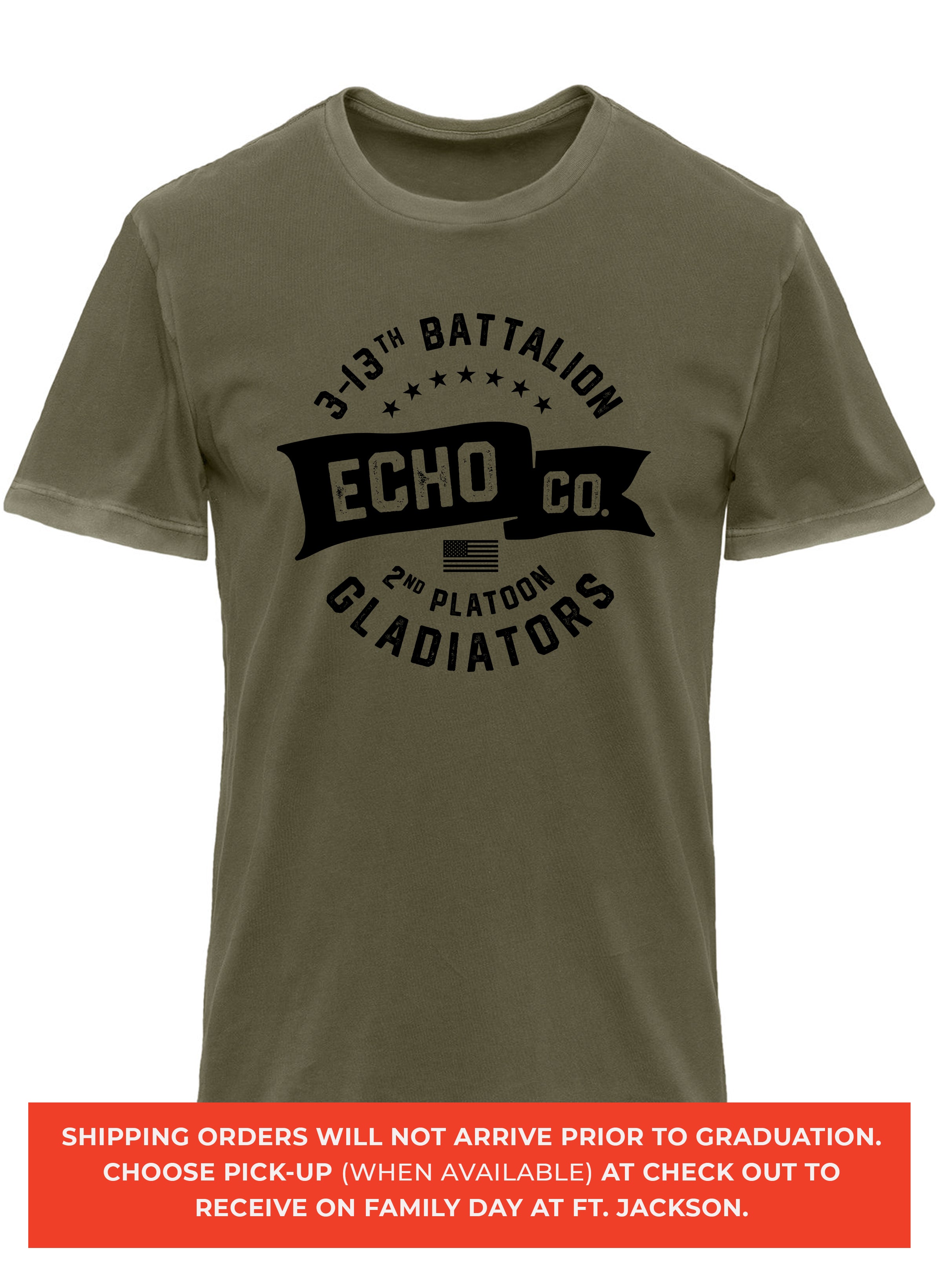 *Begin shipping the week of the graduation because shirts are custom made each week for the Soldiers, then we are able to ship the remainder to you at home!