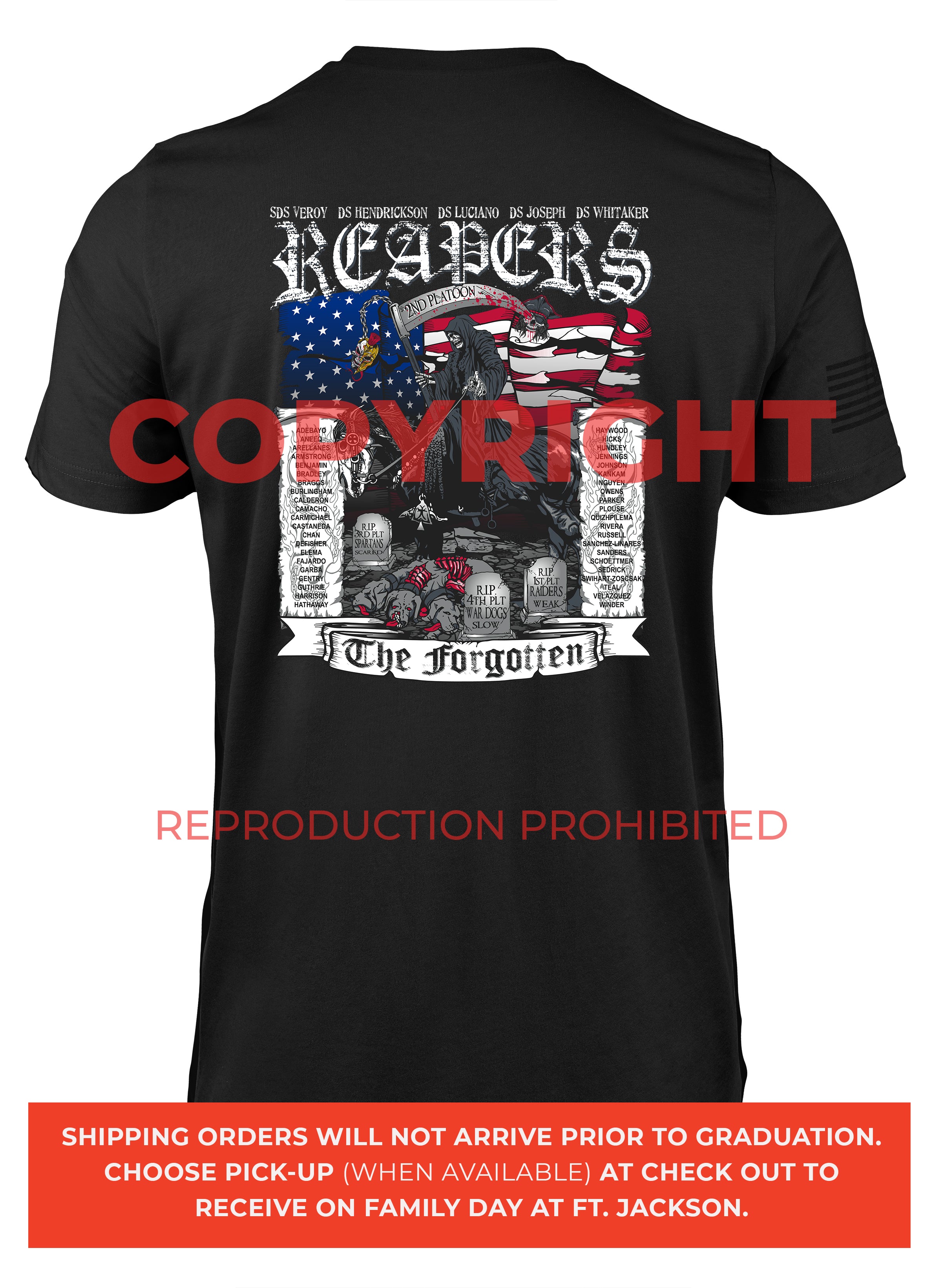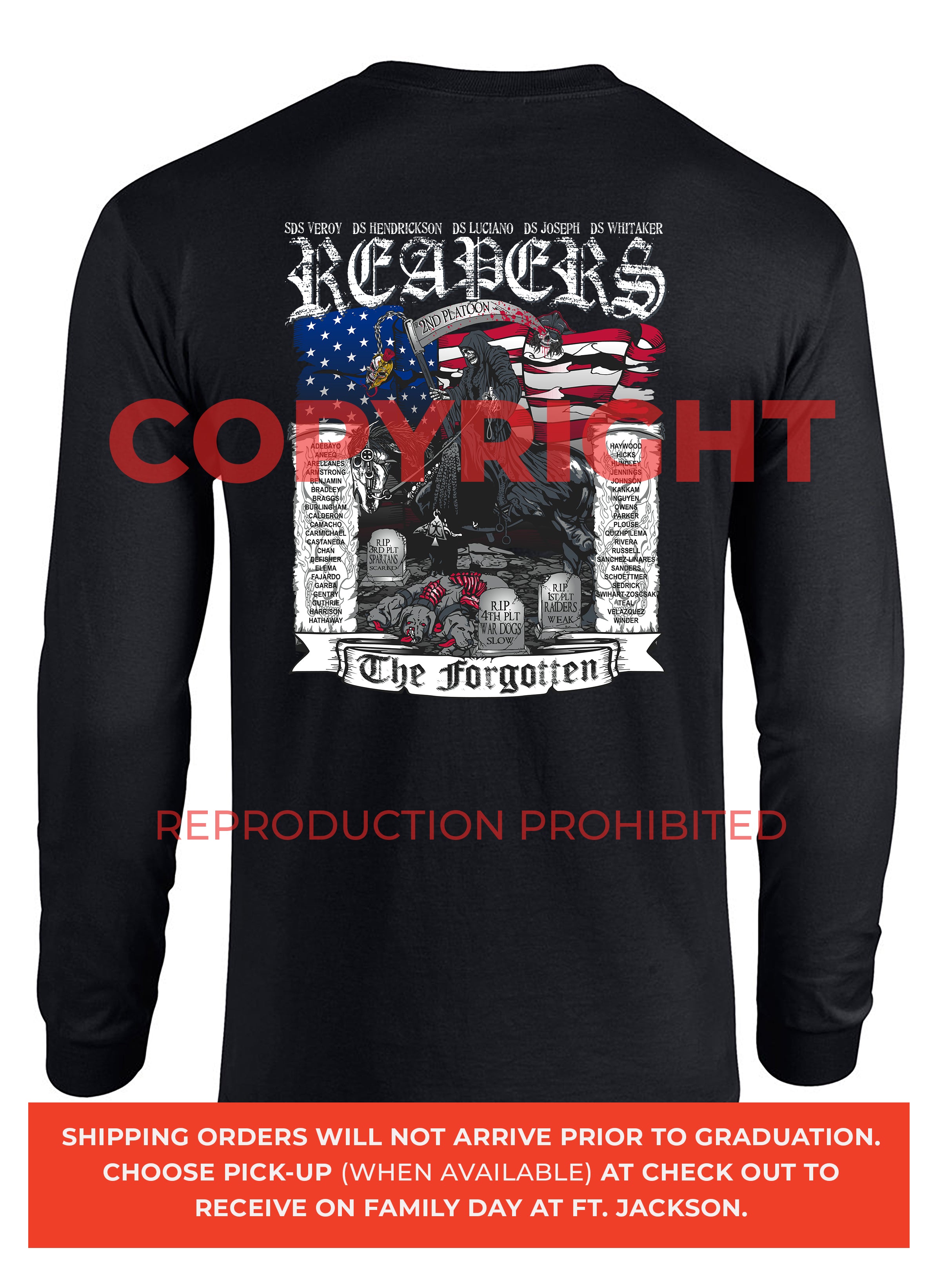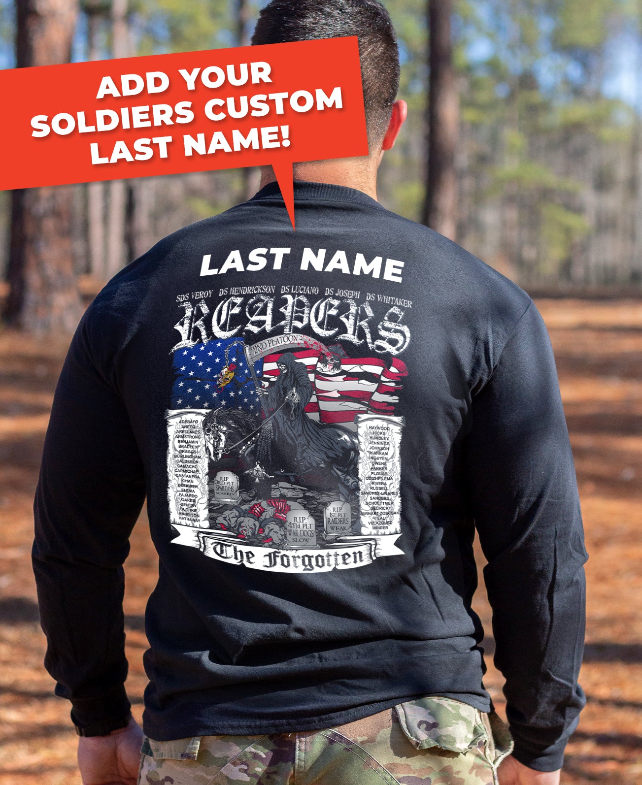 Platoon shirts features artwork designed by your Soldiers! All Platoon orders are printed on 100% black cotton, unisex sizing.  Short sleeve shirts feature the American Flag on the right sleeve.
