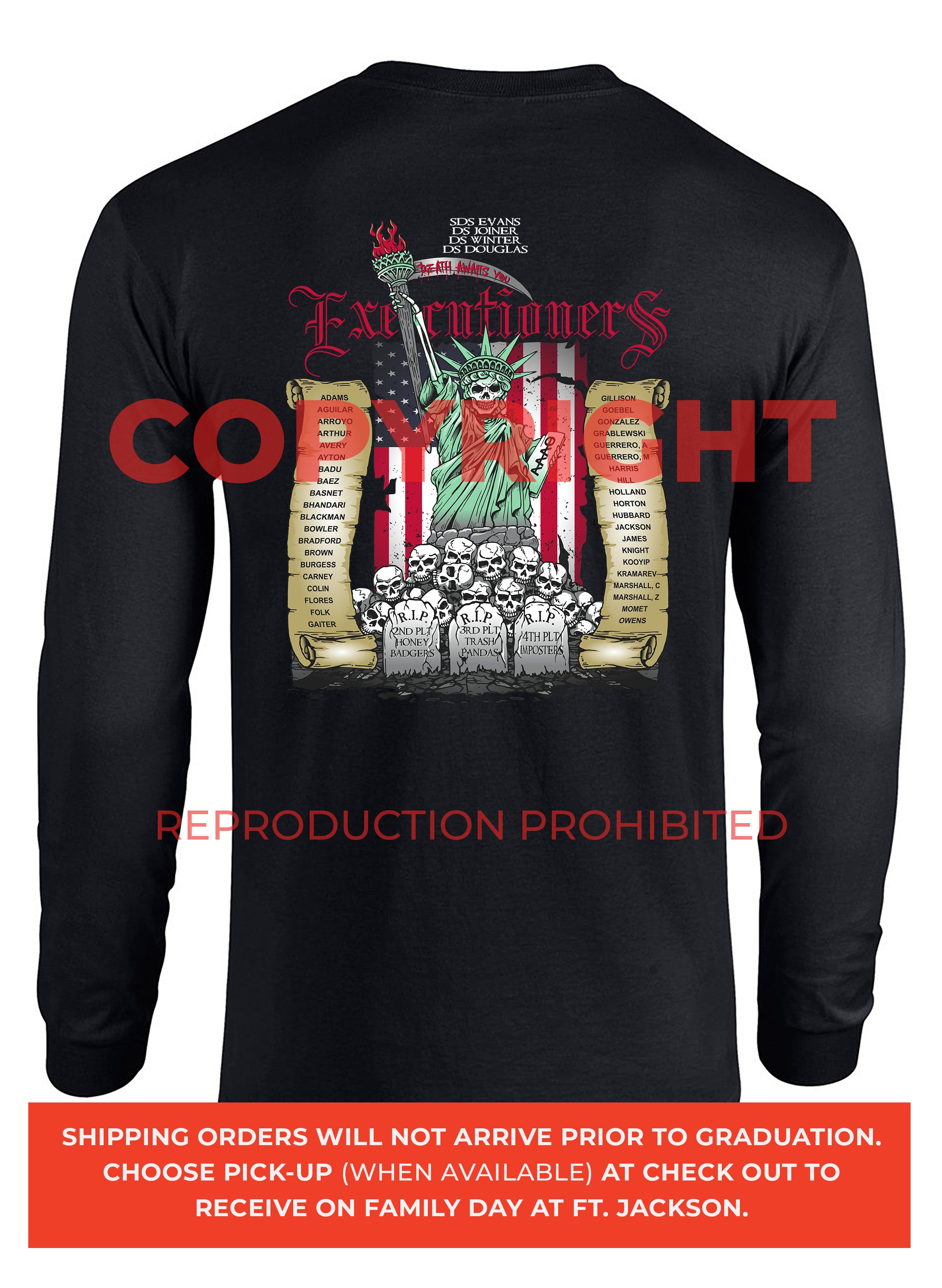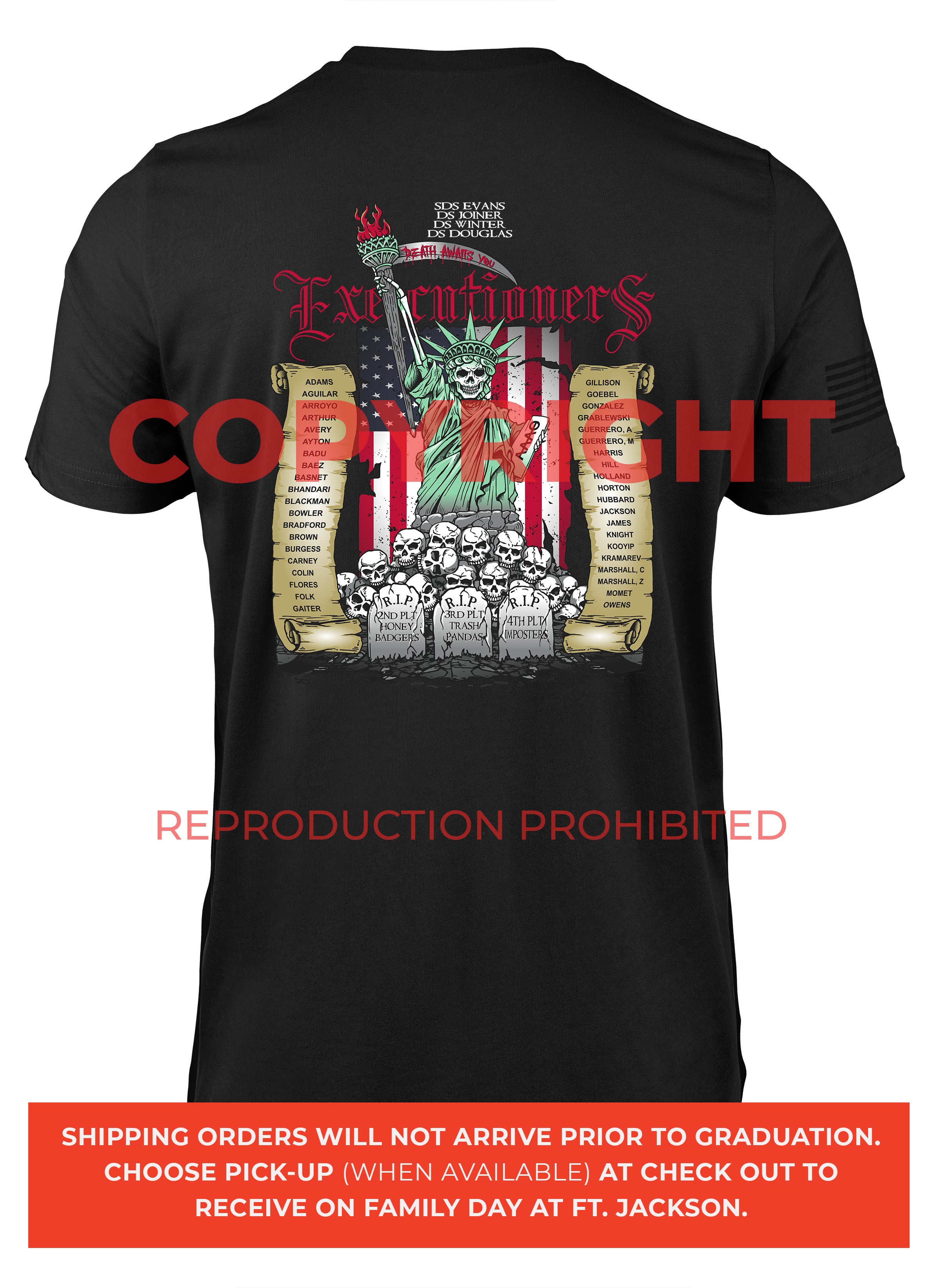 *Begin shipping the week of the graduation because shirts are custom made each week for the Soldiers, then we are able to ship the remainder to you at home!
