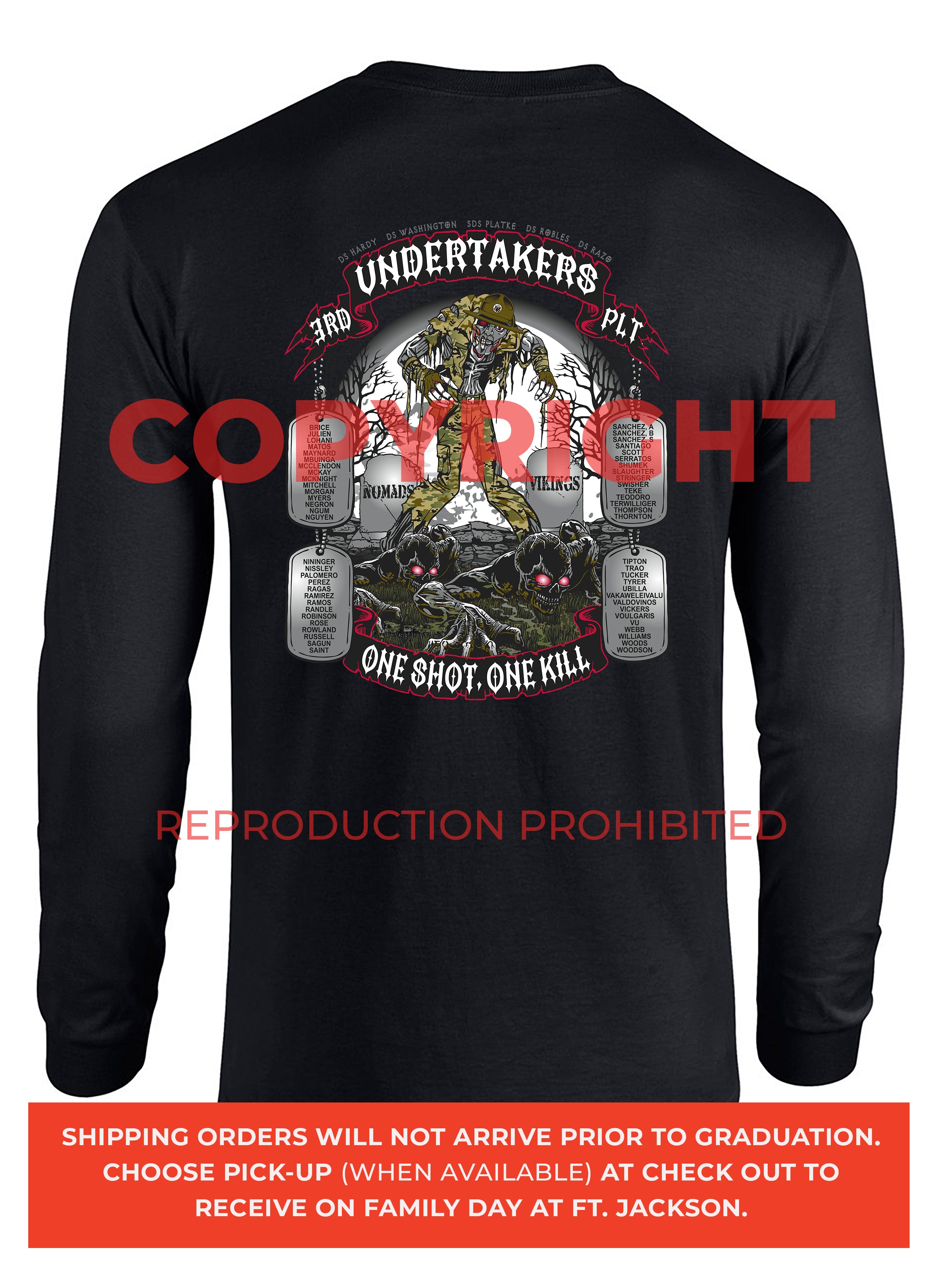 *Begin shipping the week of the graduation because shirts are custom made each week for the Soldiers, then we are able to ship the remainder to you at home!