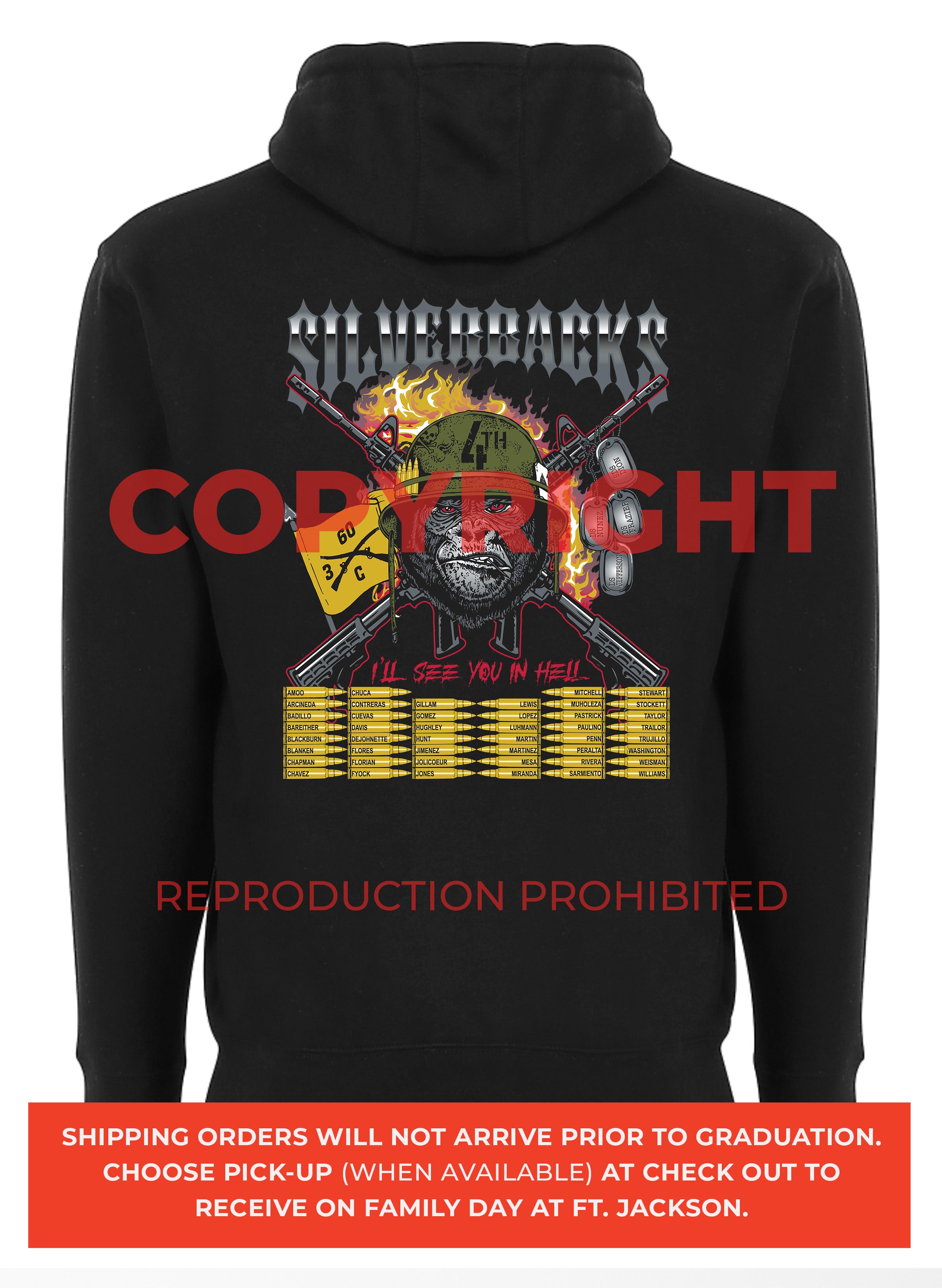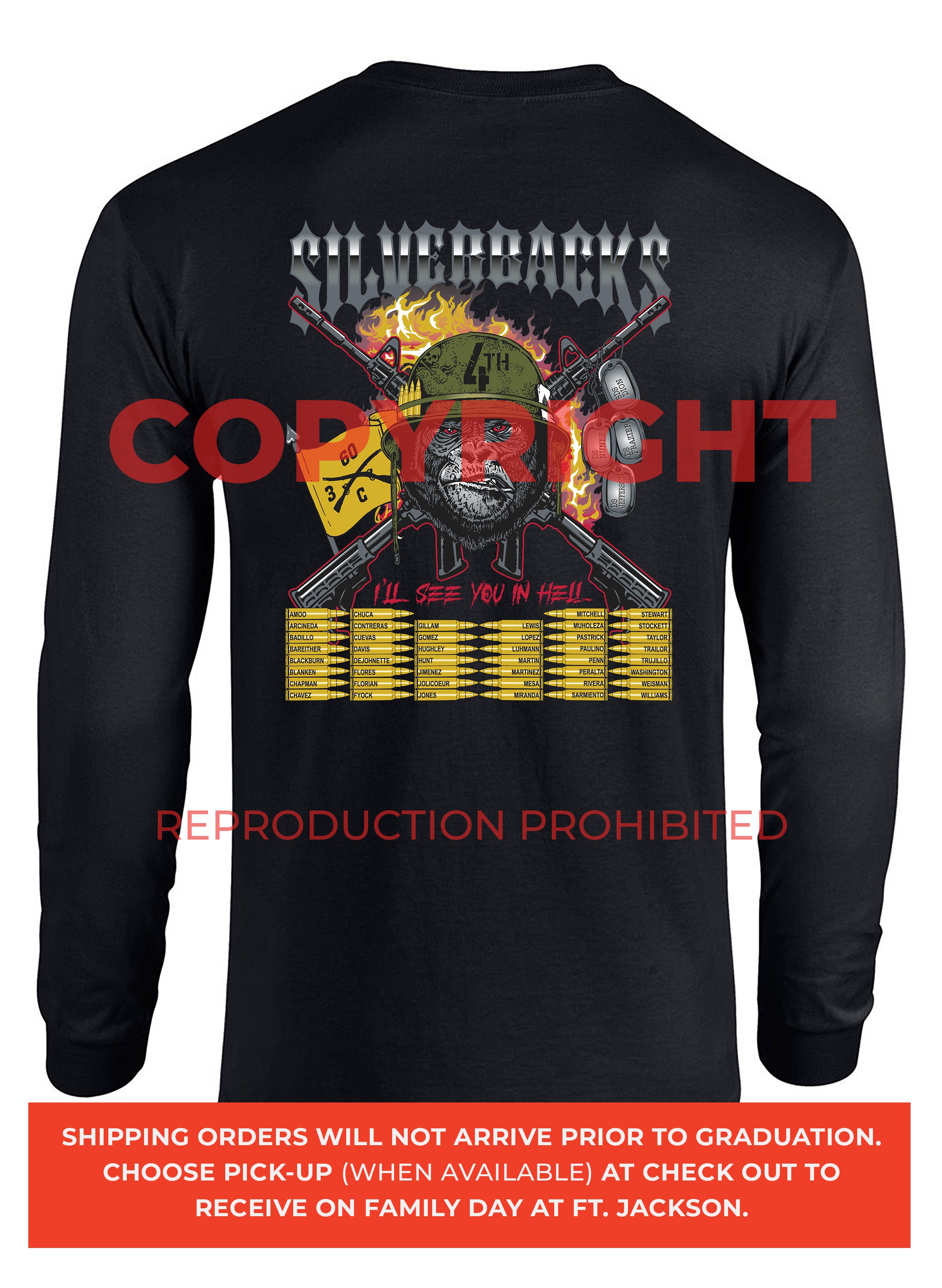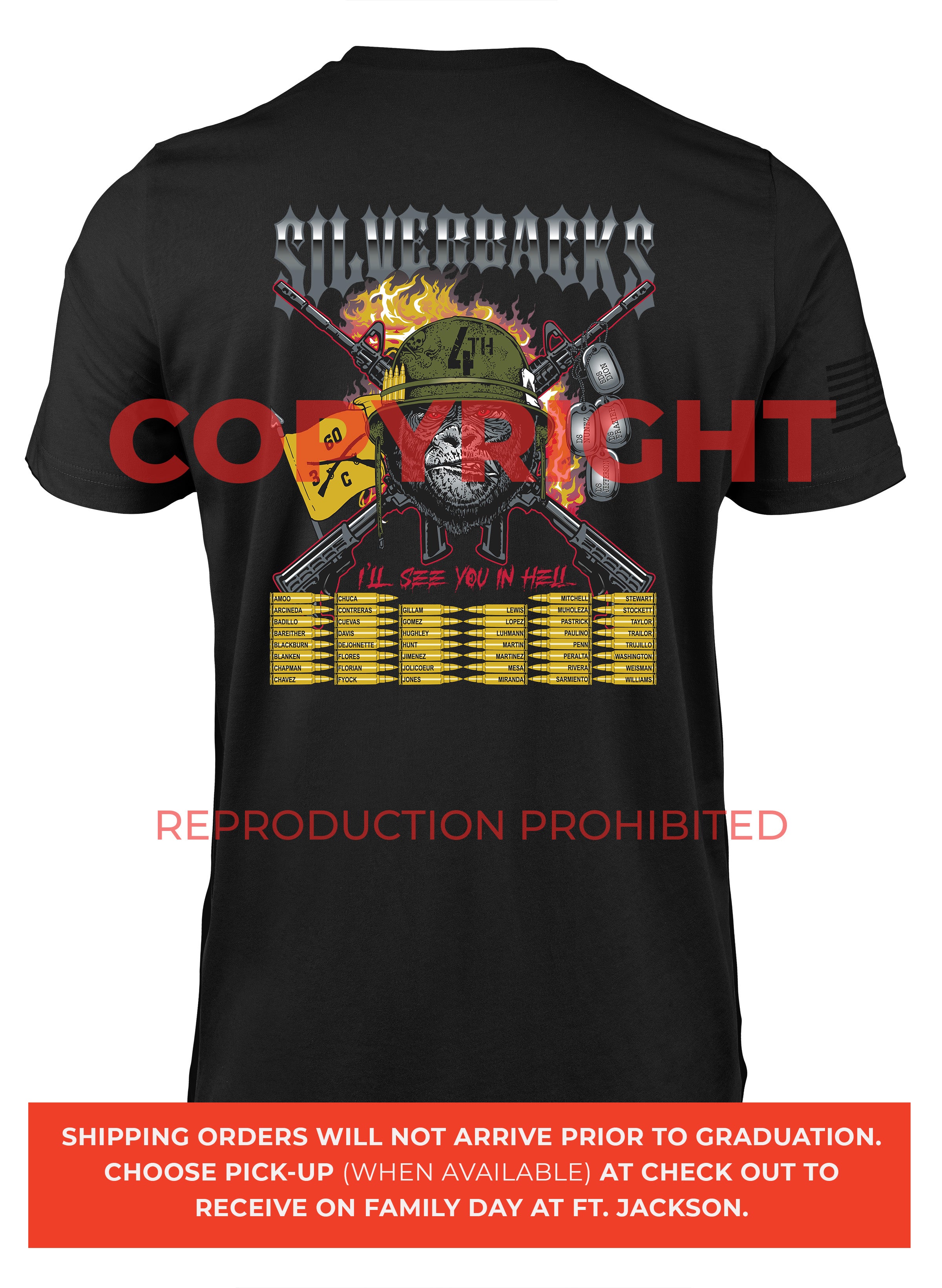 *Begin shipping the week of the graduation because shirts are custom made each week for the Soldiers, then we are able to ship the remainder to you at home!