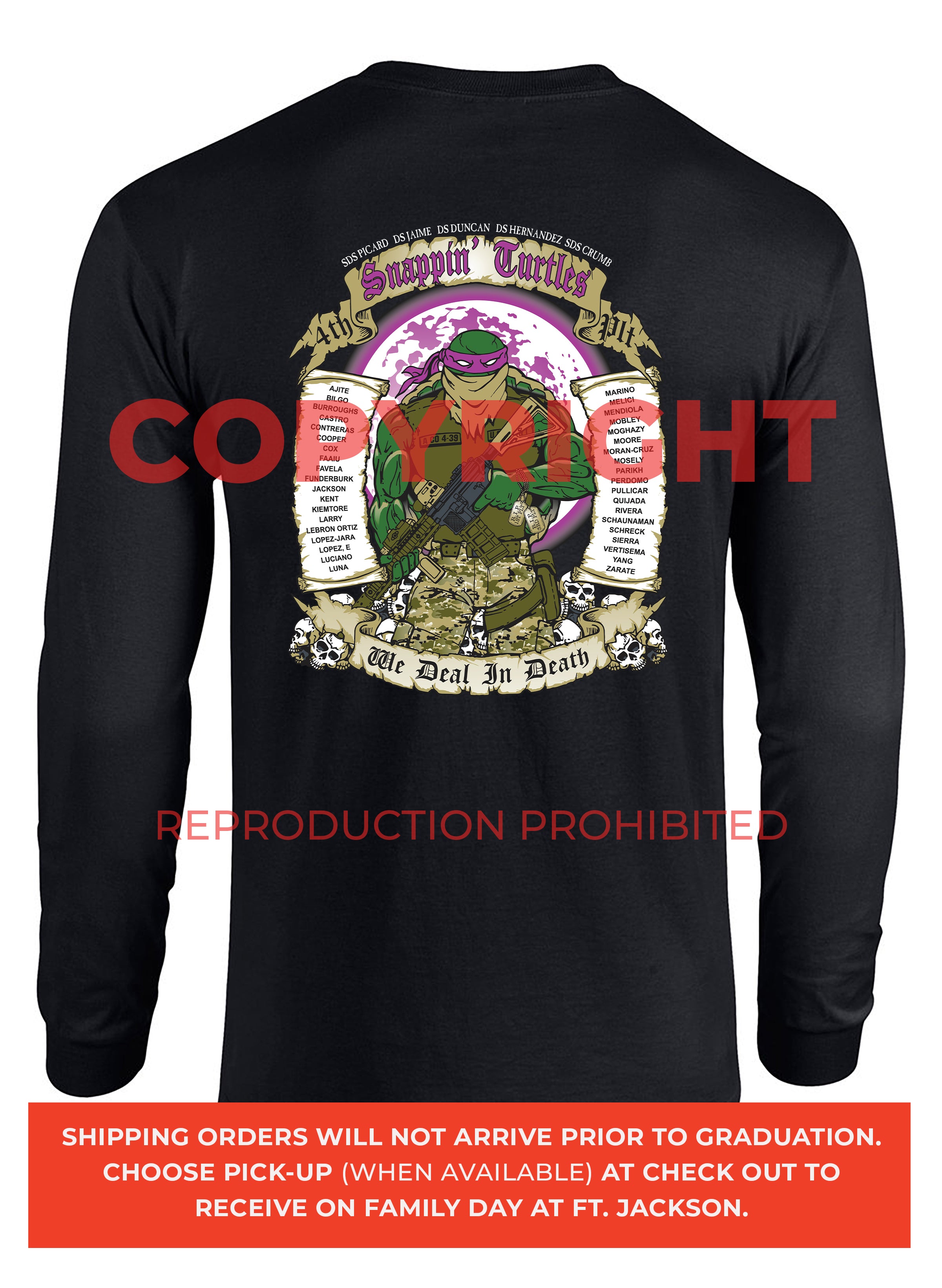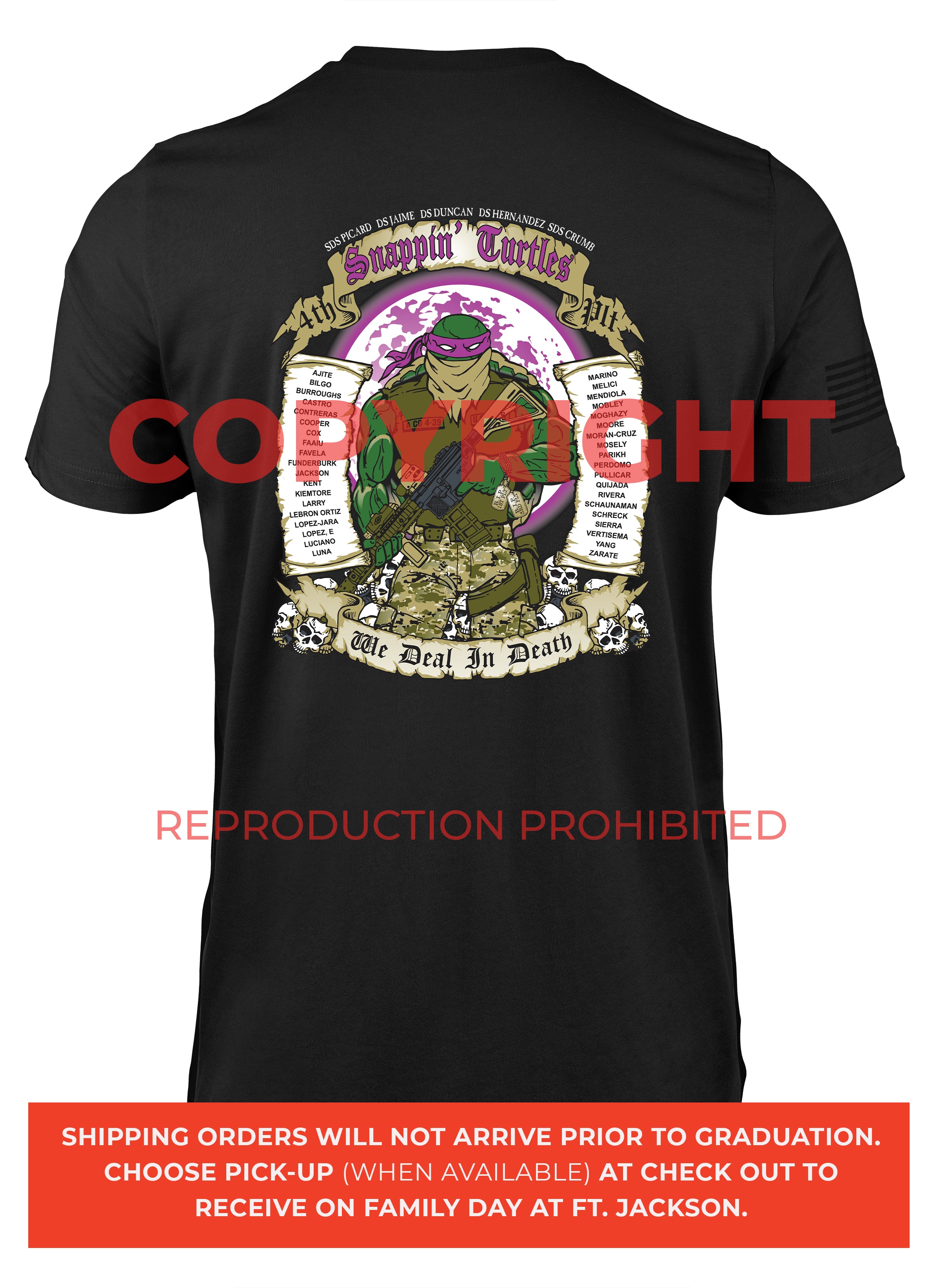 *Begin shipping the week of the graduation because shirts are custom made each week for the Soldiers, then we are able to ship the remainder to you at home!