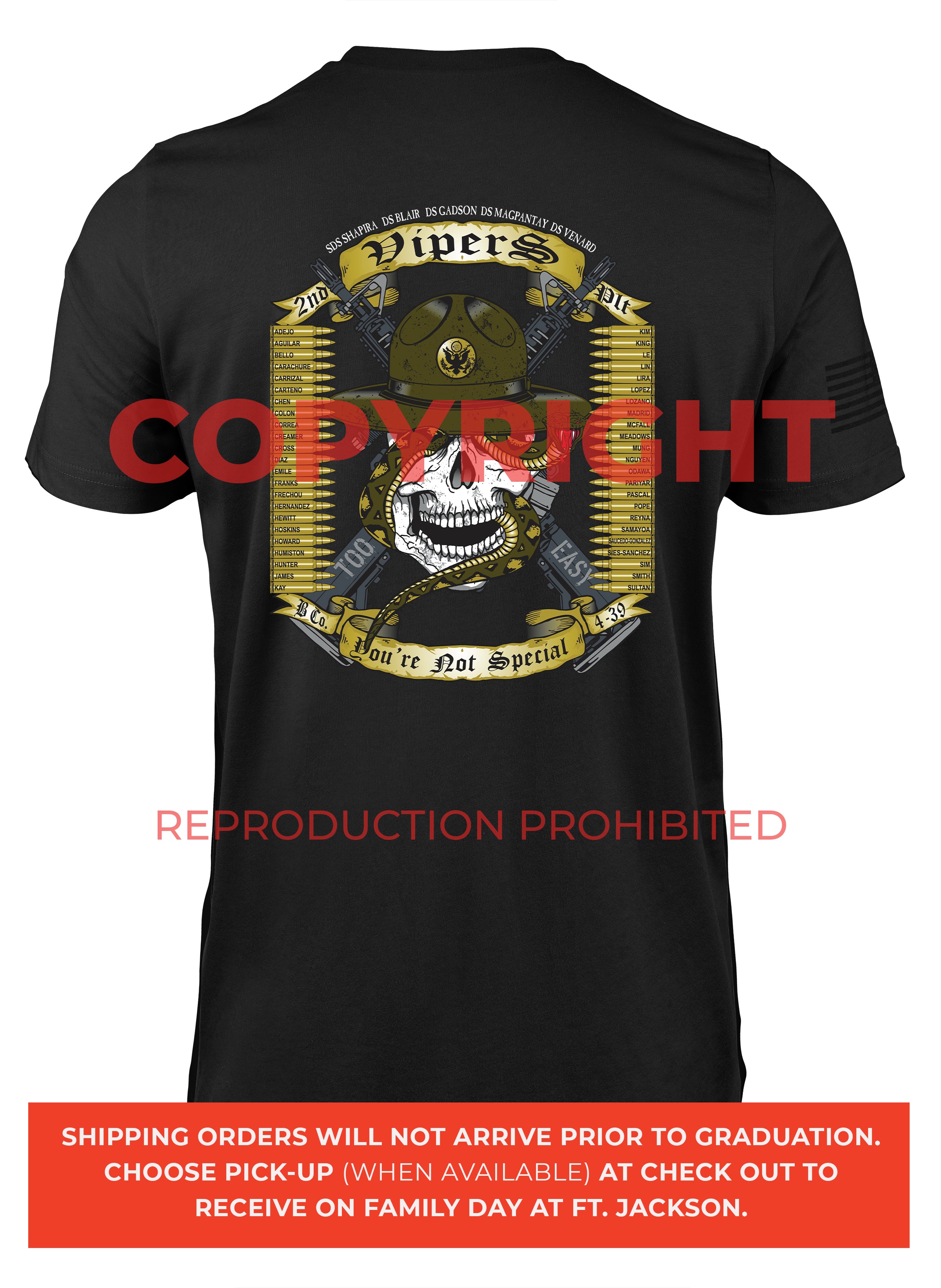 *Begin shipping the week of the graduation because shirts are custom made each week for the Soldiers, then we are able to ship the remainder to you at home!