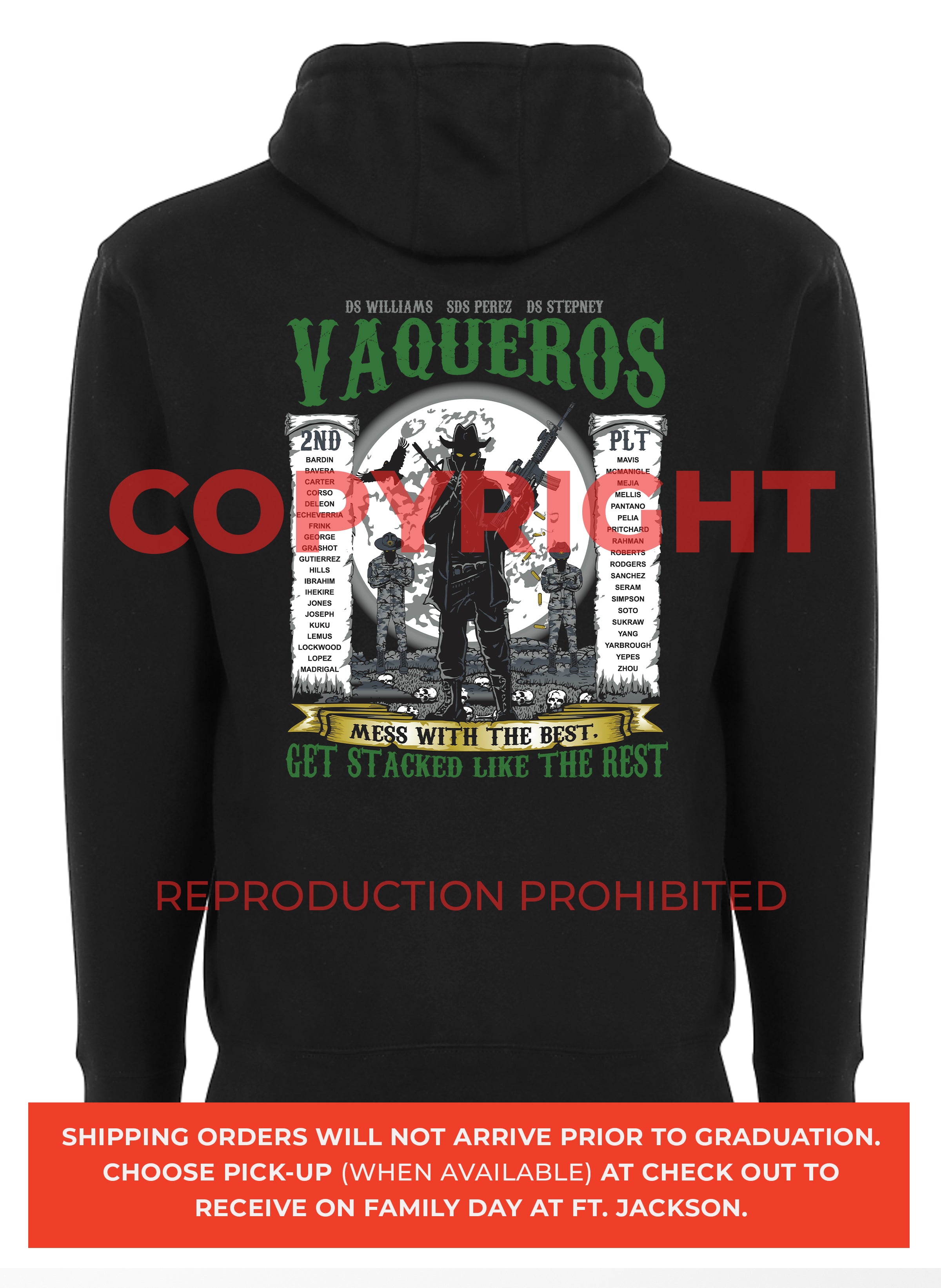 *Begin shipping the week of the graduation because shirts are custom made each week for the Soldiers, then we are able to ship the remainder to you at home!