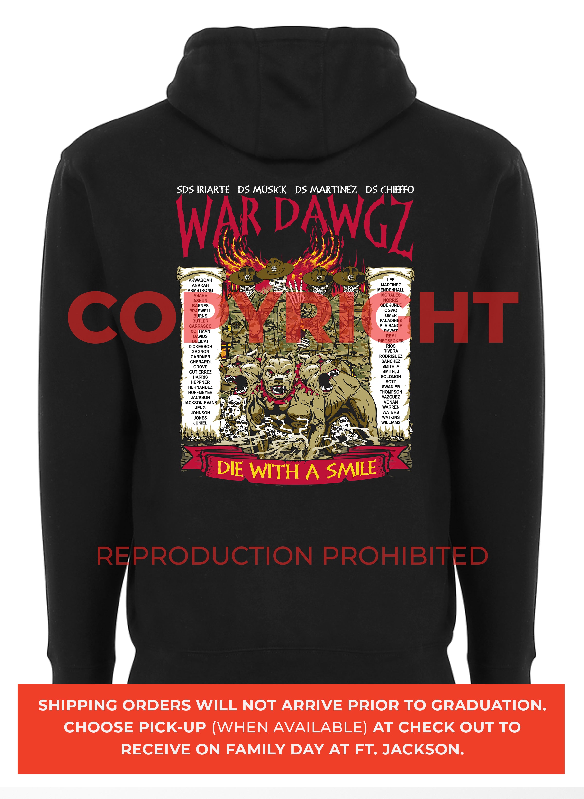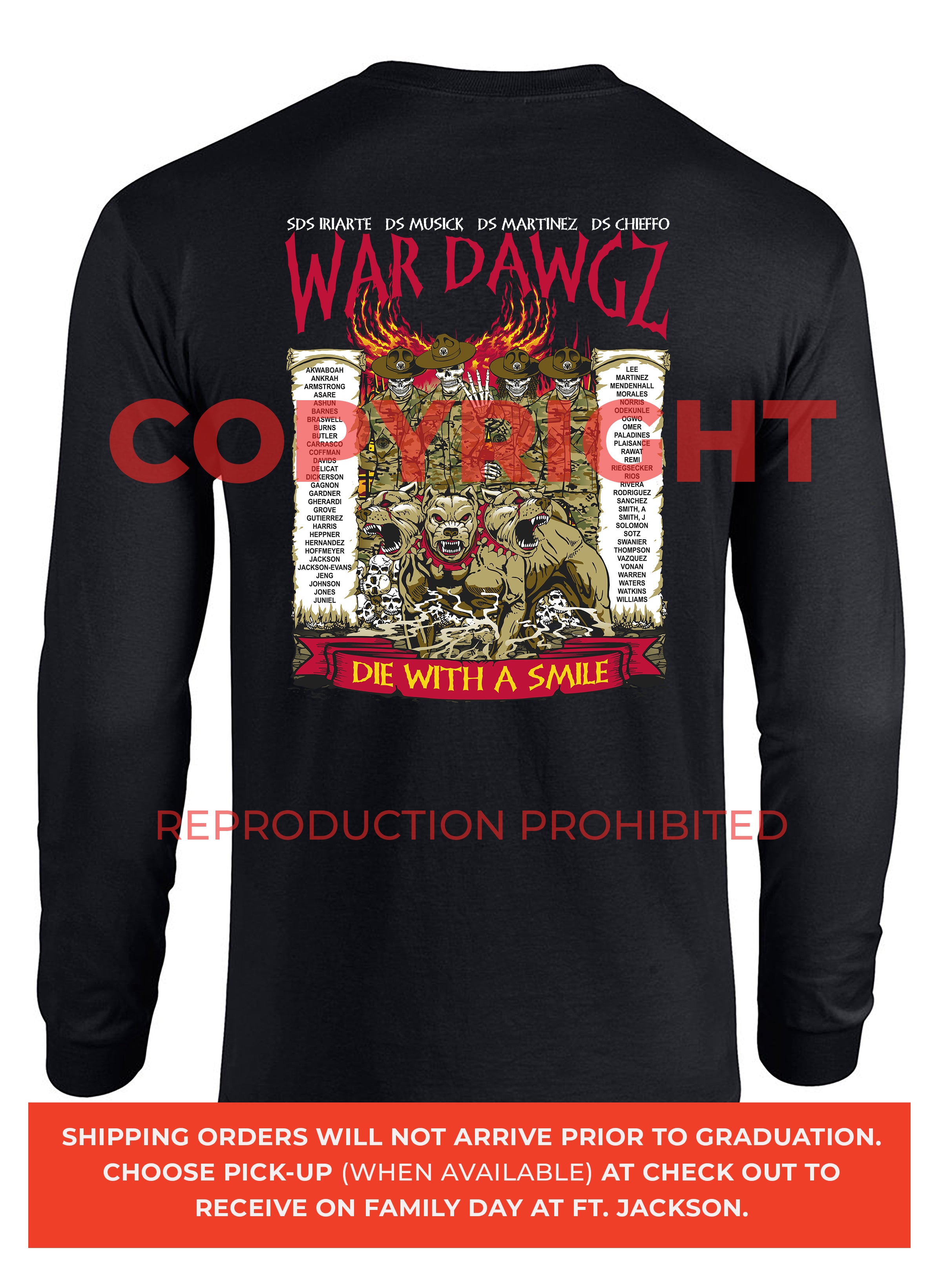 *Begin shipping the week of the graduation because shirts are custom made each week for the Soldiers, then we are able to ship the remainder to you at home!